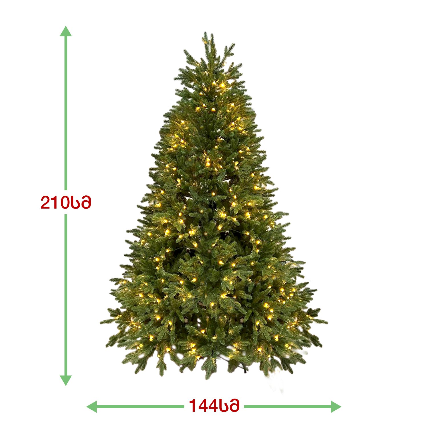 ბუნებრივის მსგავსი მწვანე ნაძვის ხე, ინტეგრირებული LED ნათურებით, დამზადებული 100% სილიკონის წიწვებით. გამძლე დრეკადი მეტალის ტოტებით და ჯანმრთელობისთვის უსაფრთხო მასალისგან დამზადებული წიწვებით. მეტალის მყარი სადგამით და მთავარი ღერძით.