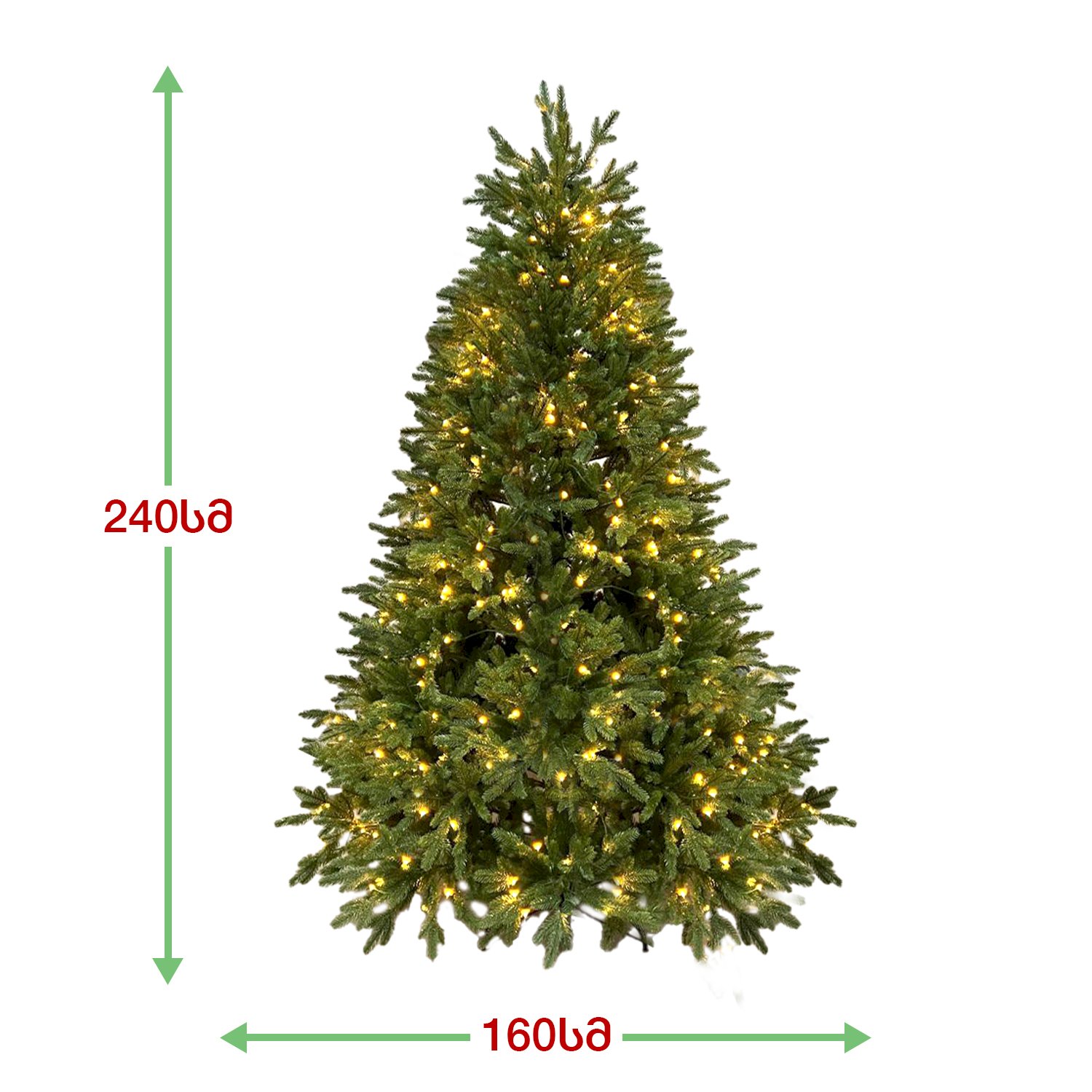 ბუნებრივის მსგავსი მწვანე ნაძვის ხე, ინტეგრირებული LED ნათურებით, დამზადებული 100% სილიკონის წიწვებით. გამძლე დრეკადი მეტალის ტოტებით და ჯანმრთელობისთვის უსაფრთხო მასალისგან დამზადებული წიწვებით. მეტალის მყარი სადგამით და მთავარი ღერძით.