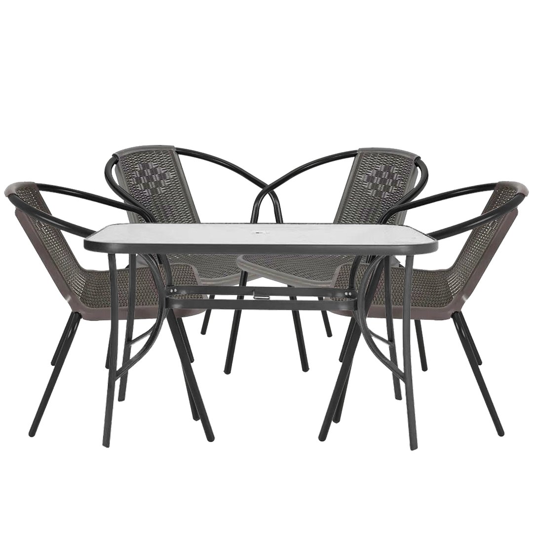 ნაწრთობი მინის მაგიდისა და მოწნული იმიტაციის,პლასტმასის სკამების კომპლექტი მეტალის კარკასით თქვენს ინტერიერსა თუ ექსტერიერს შესძენს მყუდროებას და გამორჩეულ დიზაინს.