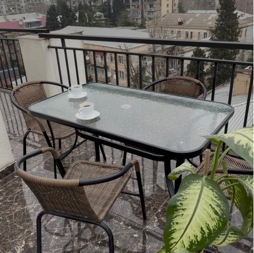 ნაწრთობი მინის მაგიდისა და მოწნული სკამების კომპლექტი მეტალის კარკასით თქვენს ინტერიერსა თუ ექსტერიერს შესძენს მყუდროებას და გამორჩეულ დიზაინს.