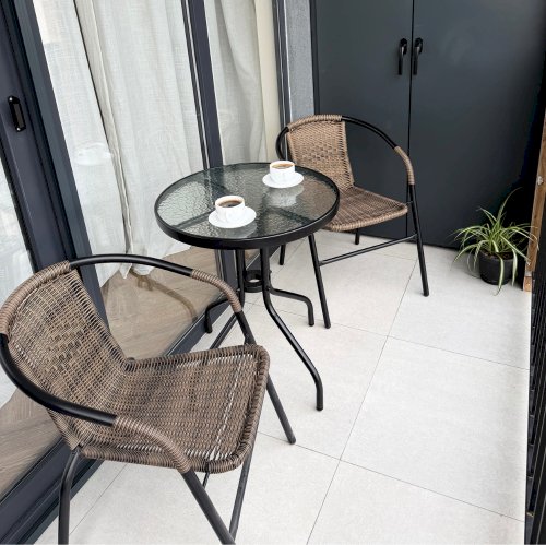 ნაწრთობი მინის მაგიდისა და მოწნული სკამების კომპლექტი მეტალის კარკასით თქვენს ინტერიერსა თუ ექსტერიერს შესძენს მყუდროებას და გამორჩეულ დიზაინს.