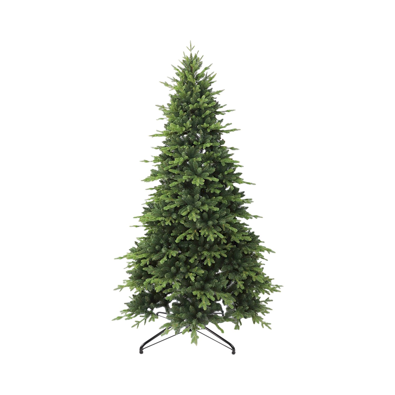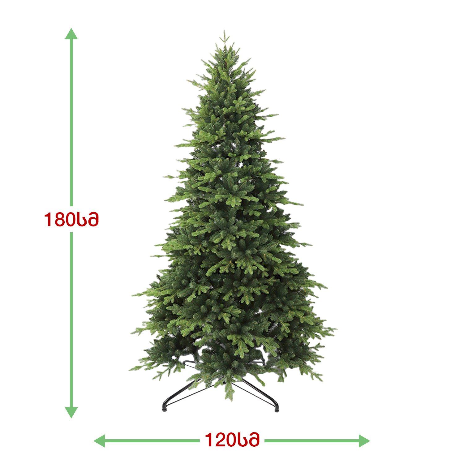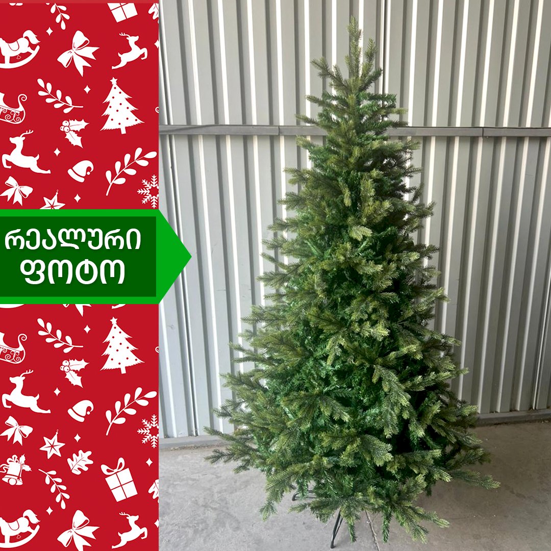 ბუნებრივის მსგავსი ნაძვის ხე, დრეკადი მეტალის ტოტებით და ჯანმრთელობისთვის უსაფრთხო მასალისგან დამზადებული შერეული ორი ფერის, სილიკონის და PVC წიწვით . მეტალის მყარი სადგამით და მთავარი ღერძით.
