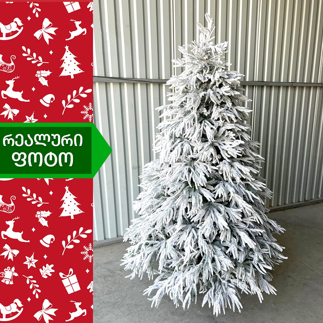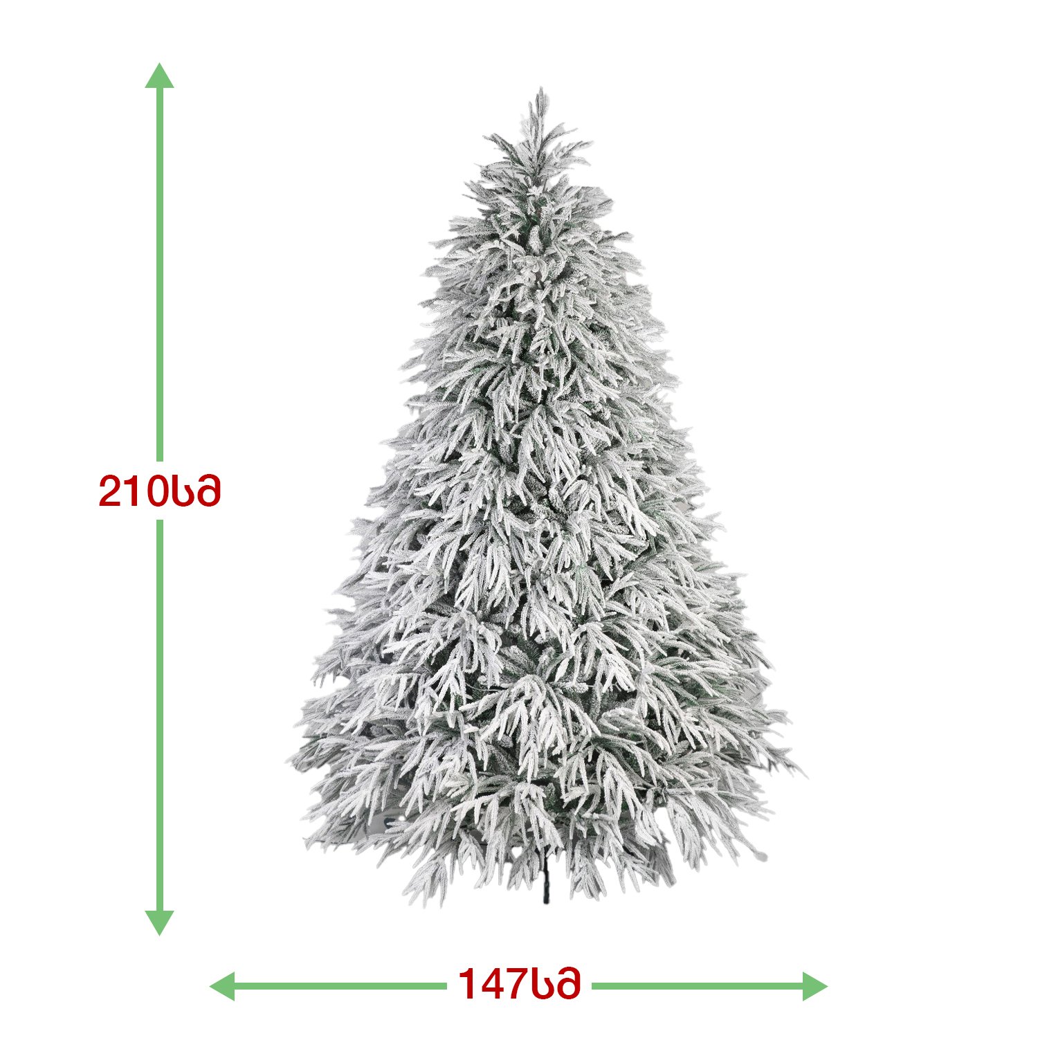 ბუნებრივის მსგავსი დათოვლილი ნაძვის ხე,  დრეკადი მეტალის ტოტებით და ჯანმრთელობისთვის უსაფრთხო მასალისგან დამზადებული შერეული ორი სახეობის სილიკონის და PVC წიწვით . მეტალის მყარი სადგამით და მთავარი ღერძით.