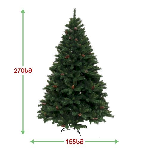 ნაძვის ხე, გაფორმებული გრძელი გირჩებით. გამძლე დრეკადი მეტალის ტოტებით და ჯანმრთელობისთვის უსაფრთხო მასალისგან დამზადებული წიწვებით. მეტალის მყარი სადგამით და მთავარი ღერძით.