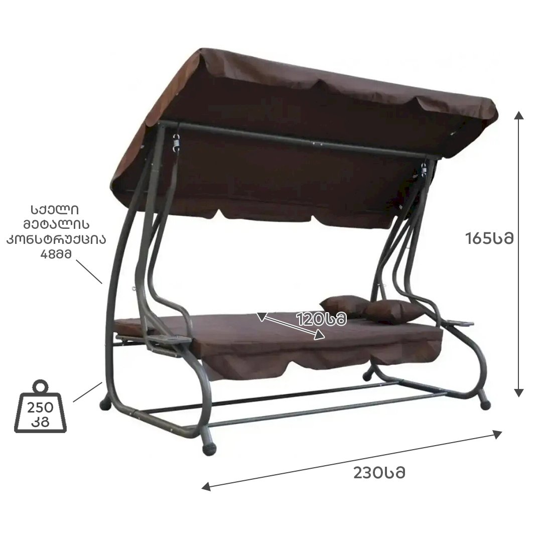 მასალა: მეტალი;პოლიესთერი სიმაღლე: 165 სმ სიგრძე: 230 სმ სიღრმე: 60/120 სმ გამძლეობა: 250კგ ფერი: ანტრაციტი/ყავისფერი